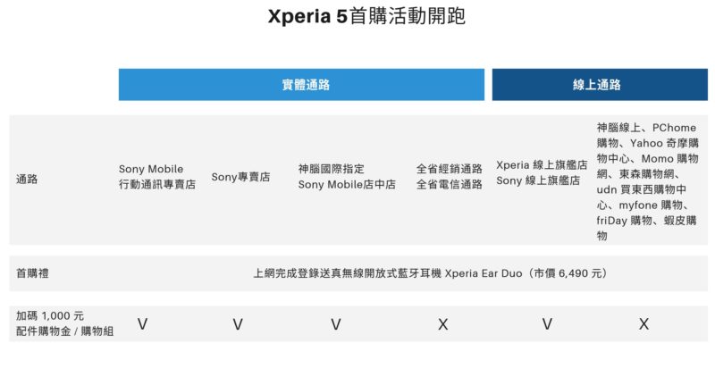 Sony Mobile 還特別規劃「1,000 元配件購物金 / 購物組」加碼活動,至 Sony Mobile 行動通訊專賣店、Sony 專賣店、Xperia 官方線上旗艦店、Sony 線上旗艦店和神腦國際指定 Sony Mobile 店中店購買 Xperia 5,將加碼贈送 1,000 元配件購物金 / 購物組,購物金或購物組合內容,依活動通路公告為準。