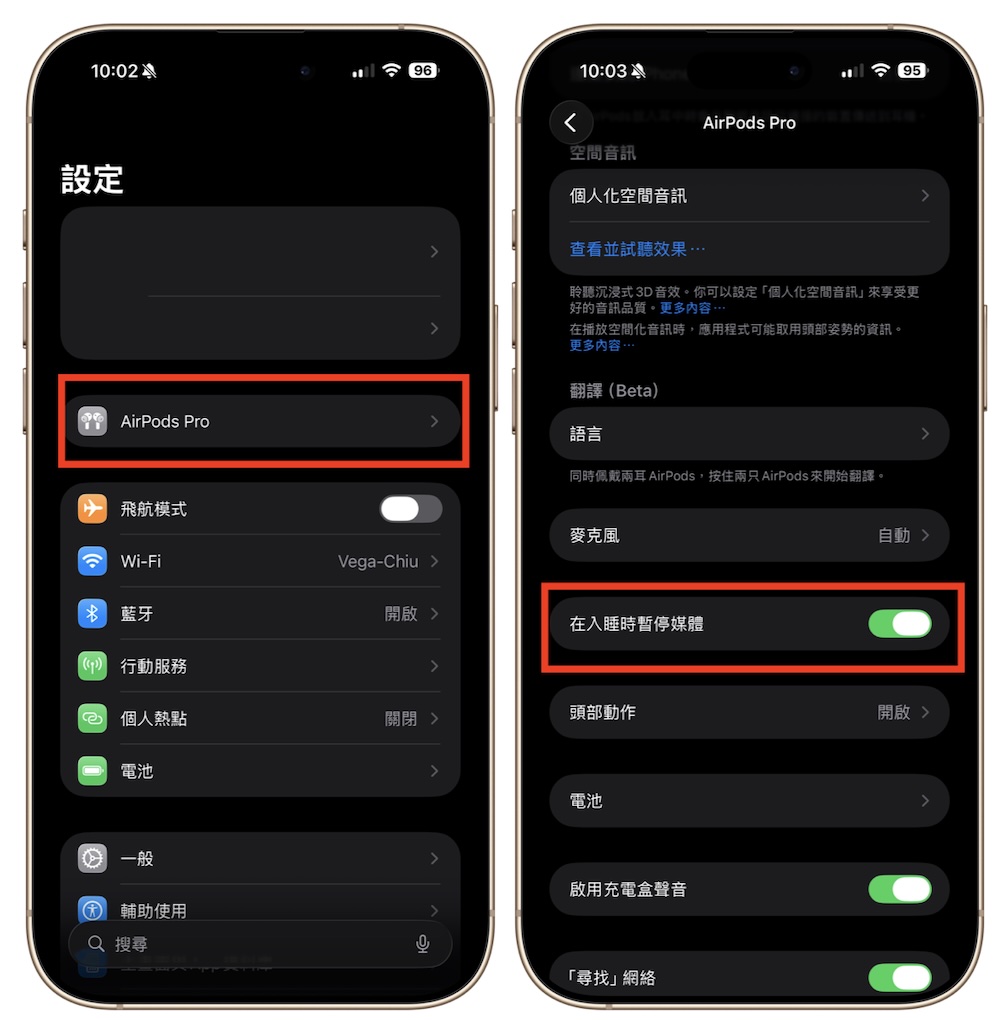 使用方式也相當簡單,用戶只需前往 iPhone 的「設定」、「AirPods」頁面,即可找到「入睡時暫停媒體播放」的開關。開啟後,系統會在偵測到使用者睡著時自動暫停播放,隔天醒來便不必再花時間回頭找播放位置。