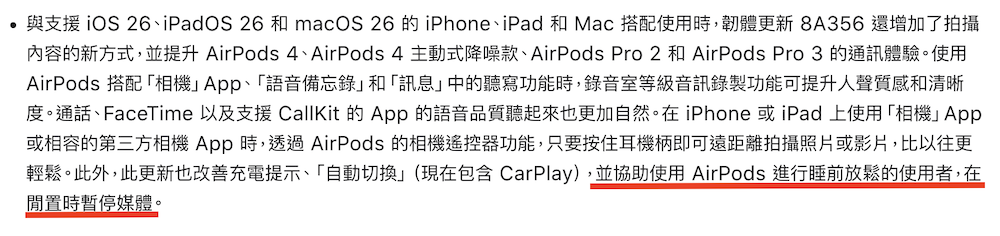 對不少使用者而言,睡前佩戴 AirPods 聽內容已成為日常習慣,但若不慎睡著,隔日往往得花一段時間找回進度。新功能的加入,讓這類使用情境更貼近真實需求。