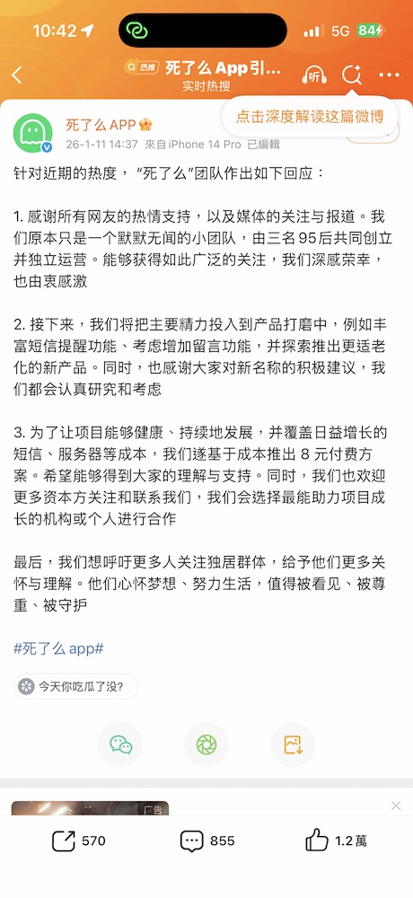 從一款成本極低、功能極簡的工具,到成為折射獨居世代焦慮與城市化壓力的現象級產品,「死了麼」的爆紅,已不只是單一 App 的成功案例,更映照出當代中國年輕人對安全感、被看見與被記得的集體需求。在資本與競品陸續進場之際,這款帶著黑色幽默的 App,能否走得更遠,也成為外界持續關注的下一個焦點。